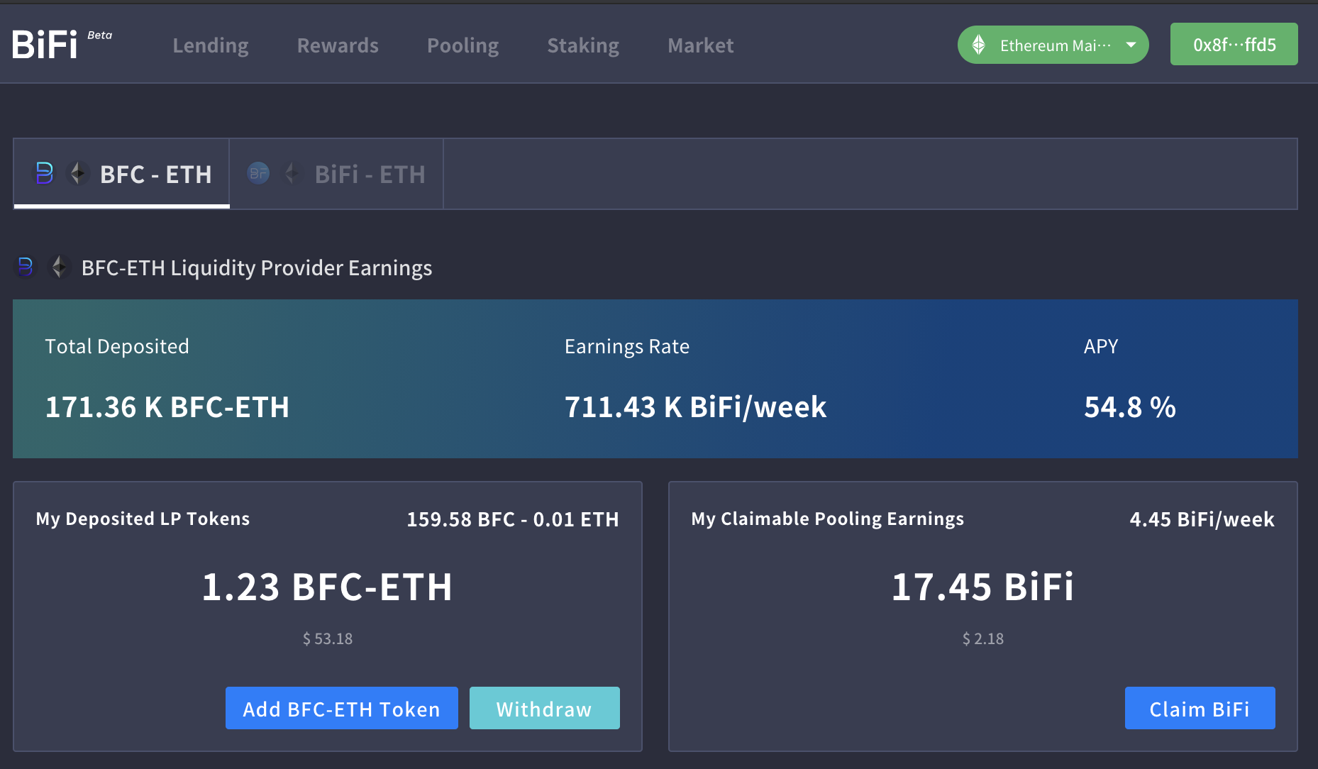 BFC-ETH Liquidity Provider Earnings BiFi Pooling was created to reward users who provide liquidity in the BFC-ETH and BiFi-ETH SushiSwap pool. When users deposit the LP Tokens they receive from providing liquidity on Uniswap, BiFi rewards BiFi Tokens in return.Total Deposited Number of BFC-ETH LP Tokens currently deposited in BiFi PoolingEarnings Rate Number of BiFi Tokens to be distributed in a given weekAPY Estimated Annual Percentage Yield (APY) of BiFi Tokens on BiFi