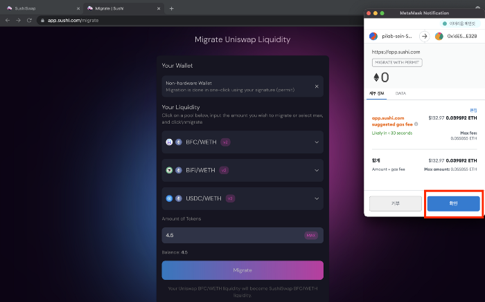 7. Migrating LP tokens will incur Ethereum gas fees. Click Confirm on your MetaMask to confirm spending the gas fees.